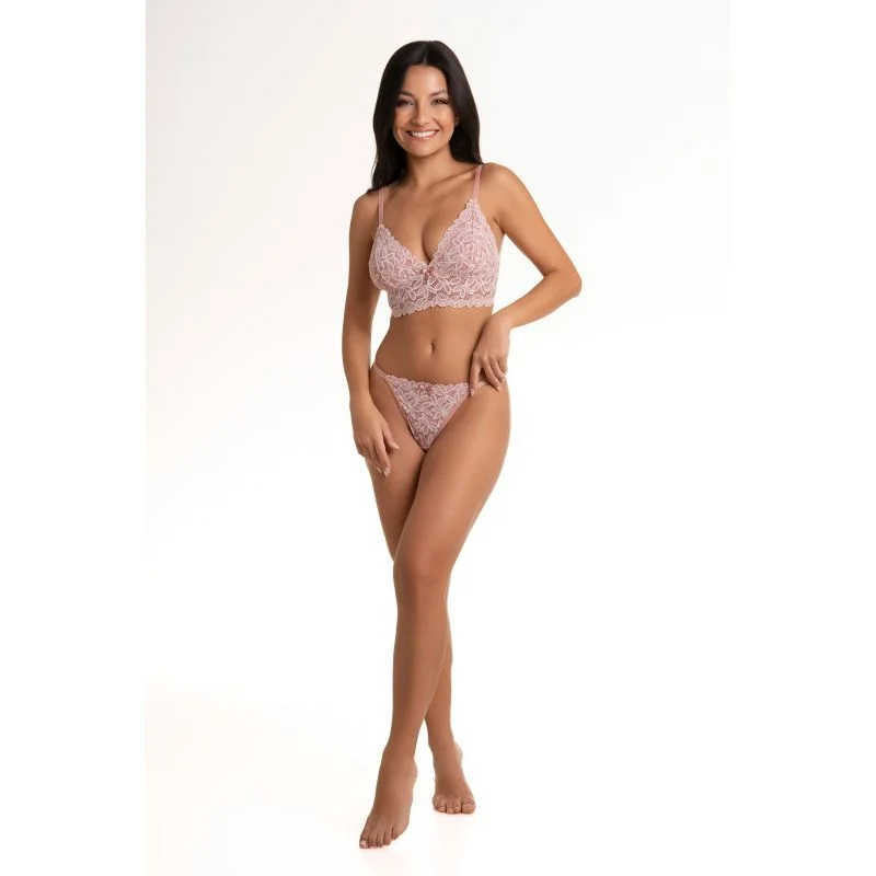 Conjunto sutiã sem bojo e sem aro e calcinha fio com alças reguláveis. Conjunto confeccionado todo em renda francesa exclusiva. Detalhes com lacinhos em cetim.
